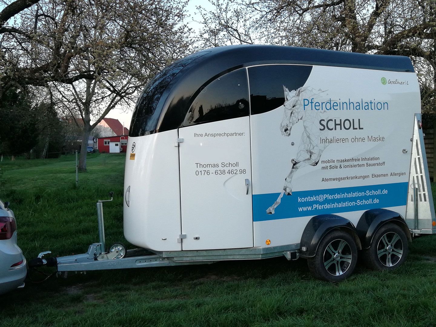 Die Inhalation findet im geschlossenen Pferdeanhänger statt. Eine Inhalationsmaske ist den Tieren oft unheimlich und unangenehm. Viele Pferde stehen im Anhänger entspannter und können so besser und tiefer einatmen. So kann der Solenebel seine Wirkung voll entfalten. Außerdem kann die Therapie so auf das gesamte Pferd ausgeweitet werden und die Sole auch auf die Haut wirken, was gerade bei z.B. Ekzemern und Allergikern mit Hautproblemen große Erleichterung bringen kann.
